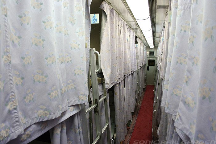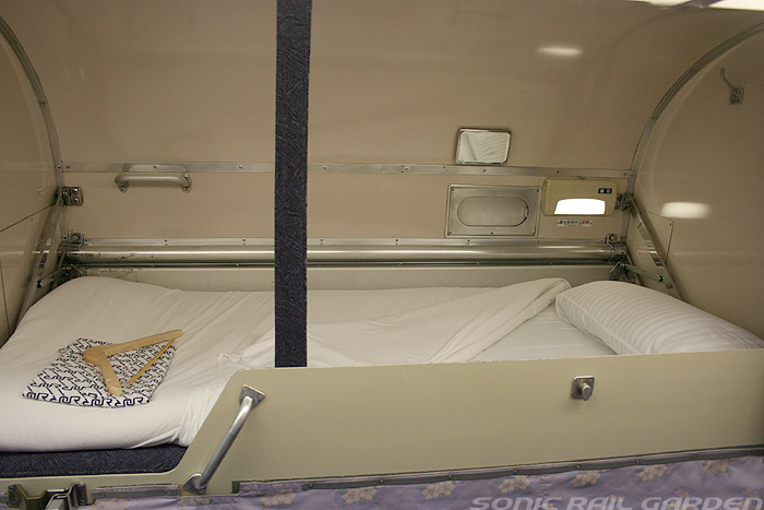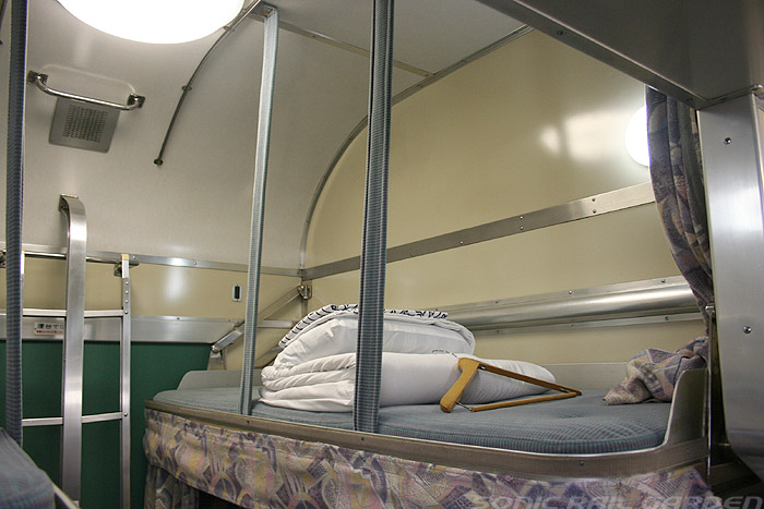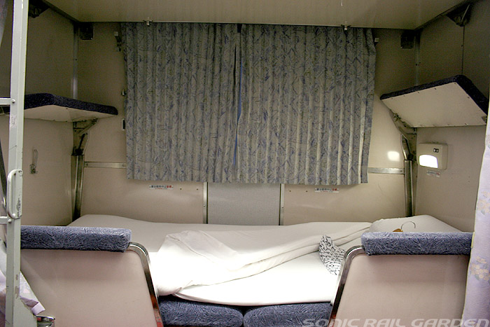 This is very basic sleeper in Japan. 4 beds are in one section. Lower berth is 195 cm X 70 cm X 111 cm. (Length/Width/Height) Upper berth is 195 cm X 70 cm X 95 cm. Lower berth has a little more head room.